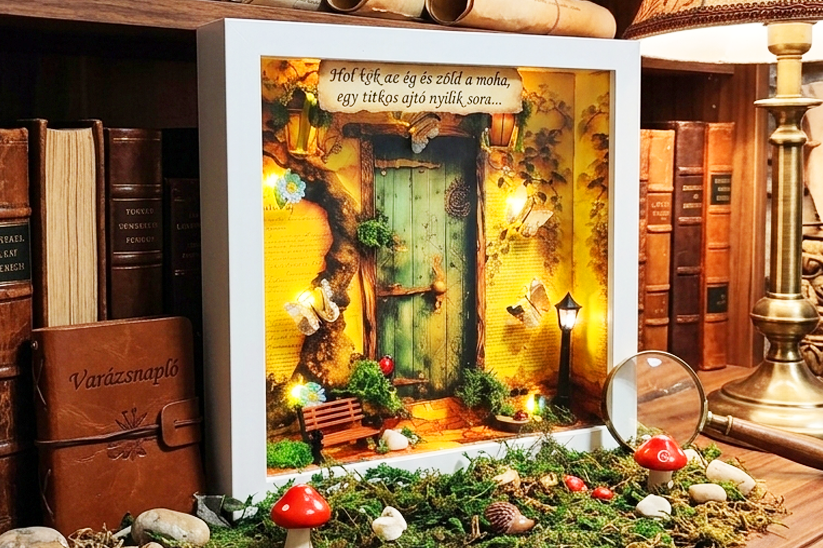 Van egy ajtó, amely csak annak nyílik ki, aki hisz a csodákban… A Tündérek kertje mesedoboz egy aprólékosan kidolgozott, varázslatos hangulatú dekoráció, amely egy titkos, fényben úszó tündérvilág kapuját idézi meg. A türkiz ajtó körül finom részletek bújnak meg: apró lámpások, virágok, kis állatkák és meleg fények, amelyek életre keltik a jelenetet. Ez a mesedoboz tökéletes választás meserajongóknak, különleges ajándéknak, gyerekszobába, olvasósarokba vagy bárkinek, aki szeretné egy kicsit közelebb hozni a varázslatot a mindennapokhoz. A finom, meleg fények meghitt, esti hangulatot teremtenek. Részletgazdag, kézzel készített egyedi darab amely saját kis történetet mesél.