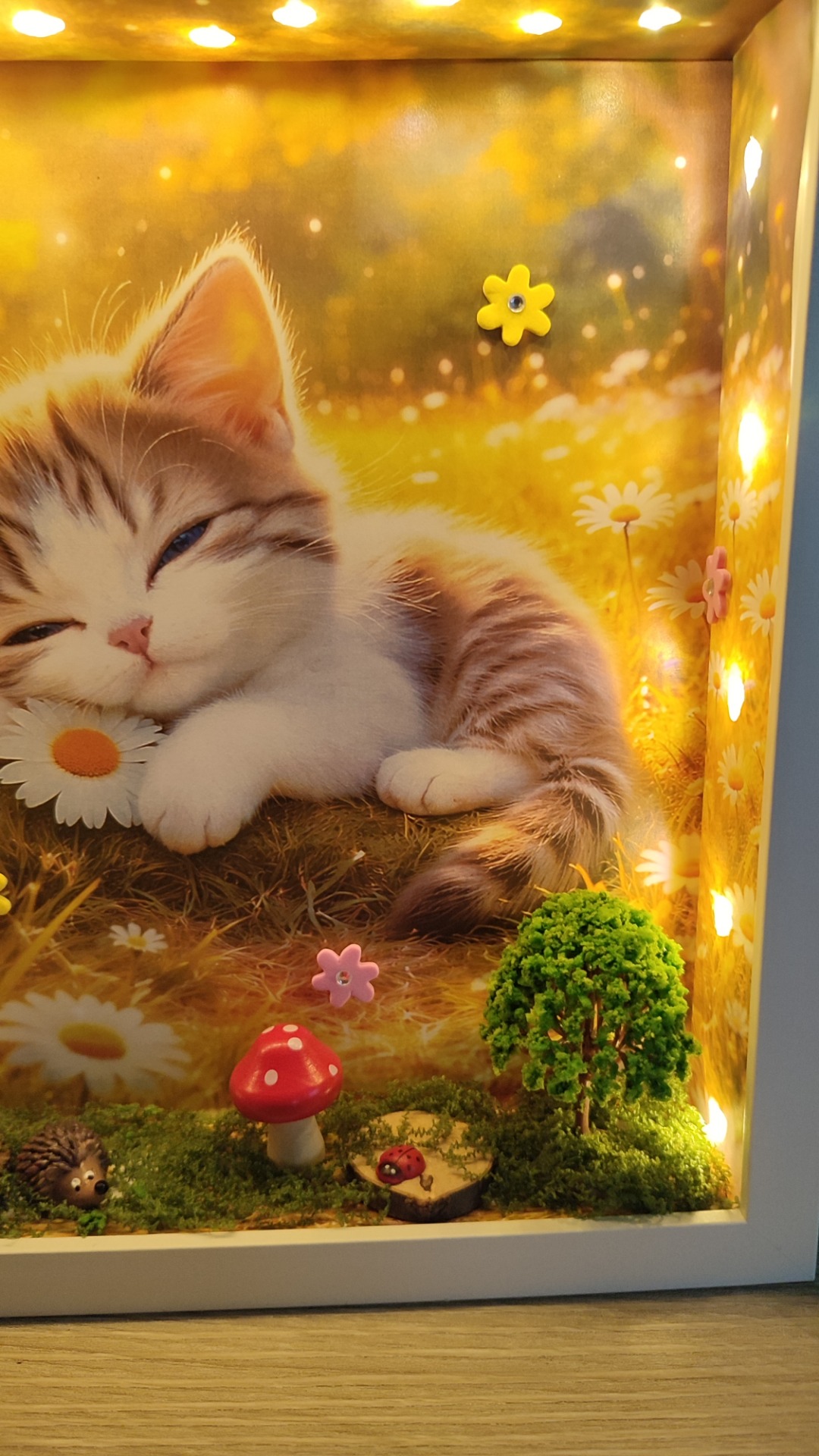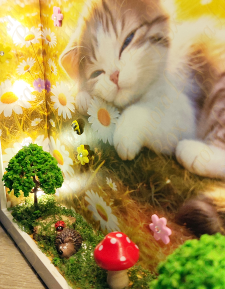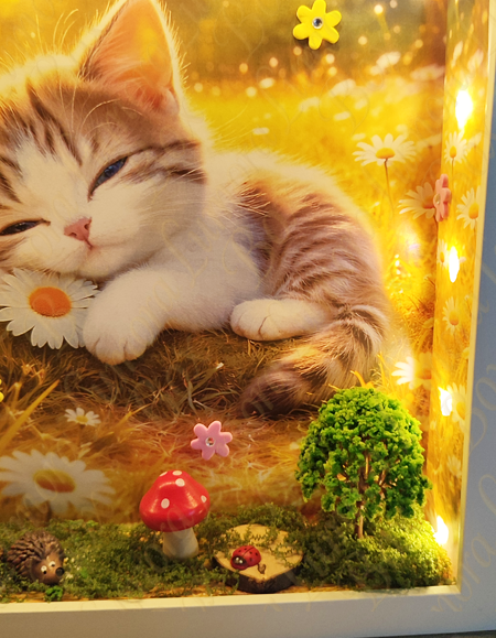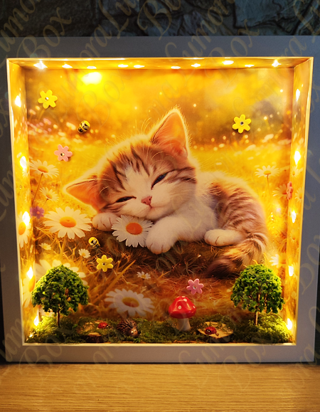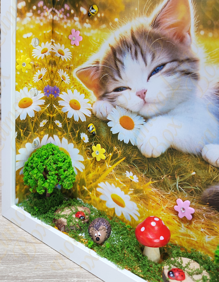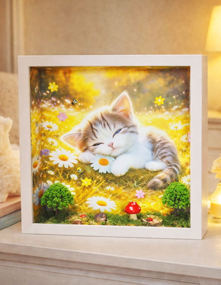 Az Álmodó cica egy apró, varázslatos erdei világba repít ahol a csend, a moha illata és a mesék találkoznak. Ebben a kézzel készített mesedobozban egy kíváncsi kis cica pihen az erdő titkai között, mintha éppen egy különleges történetről álmodna. A gondosan megformált részletek – a zöldellő moha, a fák, az erdei elemek és az apró kiegészítők – mind azt az érzést keltik, mintha egy rejtett ligetbe pillantanánk be. A jelenet egyszerre meghitt és varázslatos, tele finom részletekkel, amelyek minden egyes nézéskor új apró csodát tárnak fel. Az Álmodó Cica nem csupán dekoráció, hanem egy hangulat. Egy pillanatnyi megállás a rohanó mindennapokban. Egy emlékeztető arra, hogy a képzelet és a mese mindig ott él bennünk – csak meg kell engednünk magunknak, hogy újra higgyünk benne. Tökéletes választás gyerekszobába, nappaliba vagy ajándéknak mindazoknak, akik szeretik az erdei hangulatot, a cicákat és a különleges, egyedi alkotásokat.