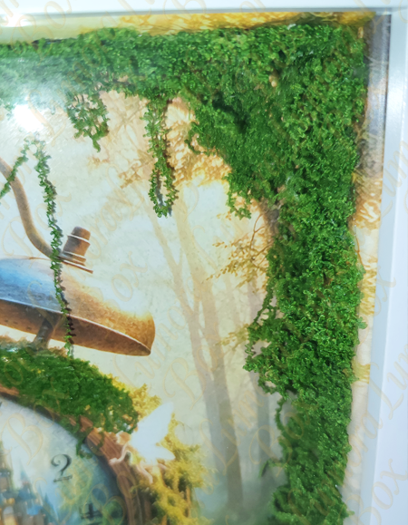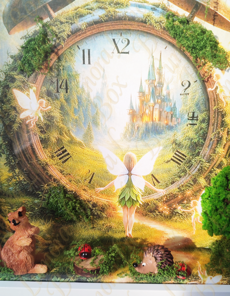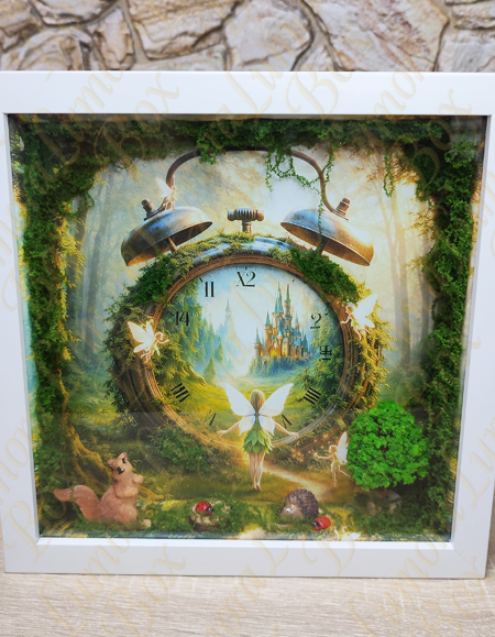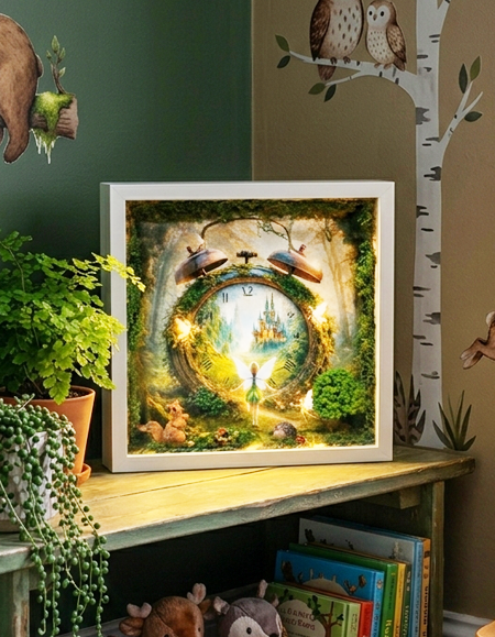 Mi lenne, ha az idő nem múlna… hanem kaput nyitna egy varázslatos világba? Az Álomóra mesedoboz egy különleges dekoráció, ahol egy moha borította ébresztőóra nem az ébredést jelzi, hanem egy titkos birodalom bejáratát rejti. A számlap mögött egy fényben úszó kastély bontakozik ki, erdei ösvénnyel, amelyen egy tündér indul el a csodák felé. A jelenetet apró részletek teszik élővé: finoman ragyogó tündérek, egy kíváncsi mókus, egy apró sün, pici katicák és buja zöld növények, melyek az idő köré fonódva mintha maguk is őriznék a titkot. Ez egy történet az időről, az álmokról és a képzelet határtalanságáról. Tökéletes akár ajándékba is mindazoknak, akik hisznek abban, hogy minden pillanat rejt egy kis varázslatot.