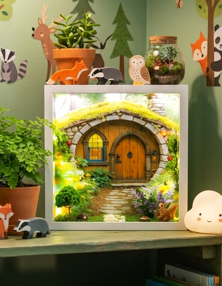 Ez a különleges dekoráció egy valódi kapu a fantázia világába, amely azonnal elvarázsol mindenkit. Ez a mesedoboz a békés, természetközeli életérzést hozza el otthonodba, hiszen ez a látvány egyenesen a legendás Megyéből való. Központi eleme a hívogató hobbit lak, amely azért idézi ilyen hűen a zsákosok otthonát, mert a félkerek faajtó és a domboldalba vájt épület a biztonság és a vendégszeretet örök szimbóluma. A zöldellő mohával borított tető és a virágos előkert az érintetlen természet nyugalmát árasztja. Egy kis szeletnyi varázslat, amely megtöri a hétköznapok szürkeségét és Középfölde hangulatát költözteti a lakásba. Kiváló választás mindazoknak, akik szeretik a mesebeli kalandokat. A látványa azonnal nosztalgikus és megnyugtató érzést kelt, mintha bármelyik pillanatban kiléphetne rajta egy pipázó hobbit. Engedd, hogy ez a mesedoboz inspirálja képzeleted minden egyes nap!