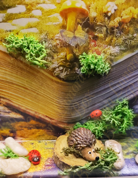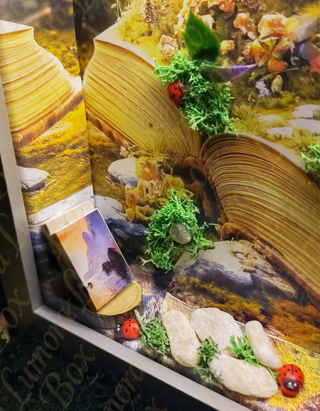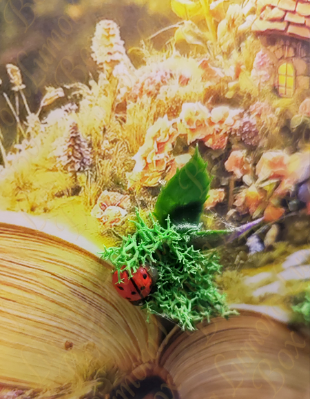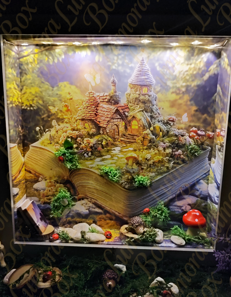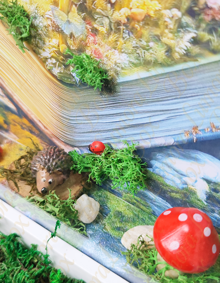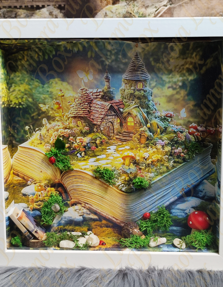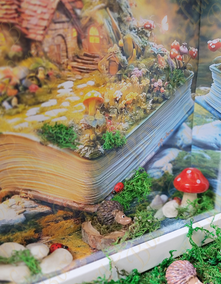 Ez a mesedoboz egyenesen a mesék birodalmába repít, ahol egy óriási, nyitott könyv lapjai közül egy titokzatos tündérfalu kel életre. A kompozíció központi eleme a buja növényzettel benőtt, rusztikus kis házikó és a hozzá tartozó, csúcsos torony. Az alkotást színpompás virágok, finom zöldek és apró, piros kalapos gombák népesítik be, élettel és mesebeli mélységgel töltve meg a teret. Minden egyes elem kézzel, gondos odafigyeléssel készült, hogy az otthonod bármely pontján egy kis megnyugvást és esztétikai élményt nyújtson. Ez a dekoráció nem csupán egy tárgy, hanem egy ablak egy olyan világra, ahol megállt az idő. Tökéletes választás azoknak, akik szeretnék a természet apró csodáit beköltöztetni a mindennapjaikba.