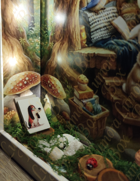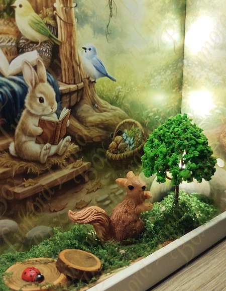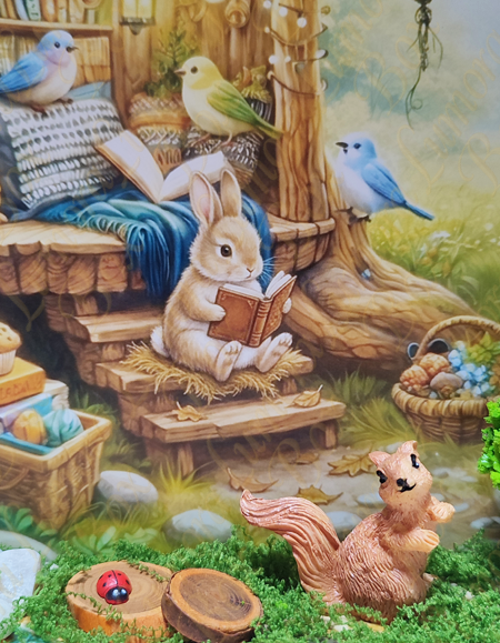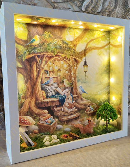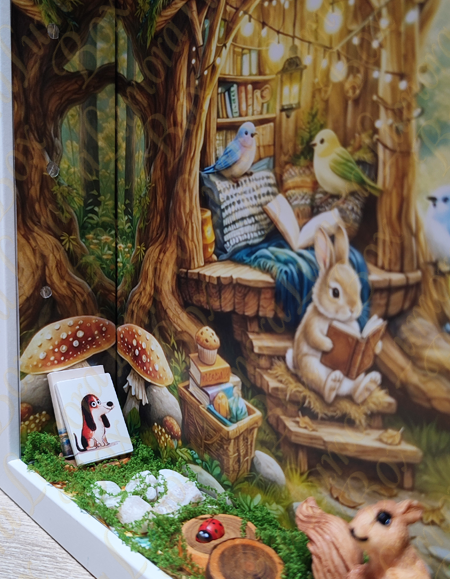 Ez a varázslatos dekoráció az erdő csendjét és az olvasás örömét ötvözi egyetlen lenyűgöző alkotásban. A szívmelengető mesedoboz egy öreg fa törzsében berendezett könyvtárat tár elénk, ahol az erdei állatok békésen merülnek el a történetek világában. A kompozíció központi alakja egy könyvet olvasó nyuszi, aki köré színes kismadarak és egy kíváncsi mókus gyűlt össze. A meleg sárga fények lágyan világítják meg a kis polcokat és a puha párnákat, mintha egy örök, békés délután pillanatát örökítenék meg. Ez a látvány azonnal nyugalmat áraszt, és segít kiszakadni a rohanó hétköznapokból minden alkalommal, amikor rátekintünk. Tökéletes választás könyvmolyoknak, a természet szerelmeseinek és mindazoknak, akik hisznek a mesék erejében. A részletgazdag kidolgozás és a barátságos karakterek élettel töltik meg a teret, bárhová is helyezzük a lakásban. Engedd, hogy ez a kis erdei menedék a Te otthonodba is becsempéssze a fantázia határtalan nyugalmát!